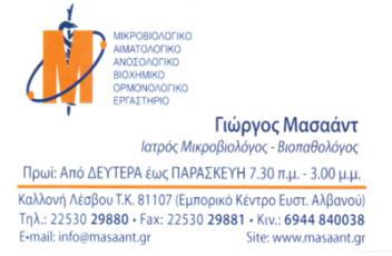 customer tabsΕπικοινωνίαΜικροβιολόγοι - ΒιοπαθολόγοιΥγείαΕντός Εμπορικού Κέντρου Ε. Αλαβάνου, Καλλονή, ΛέσβουΛΕΣΒΟΣΝΗΣΙΑ ΑΙΓΑΙΟΥ ΠΕΛΑΓΟΥΣ 2253029880 6944840038info@masaant.grhttp://www.masaant.gr Το προτείνω (έχει προταθεί 0 φορές) ΦωτογραφίεςFacebook LikeShare on FacebookTweet Widget