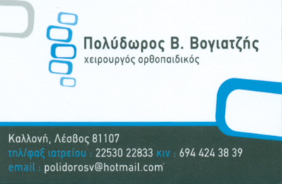 customer tabsΕπικοινωνίαΤραυματιολογία - ΟστεοπόρωσηΟστεοαρθρίτιδα - ΑθλητριατρικήΔέχεται καθημερινά 08:30 14:00Τρίτη - Πέμπτη - Παρασκευή 17:30-20:30Χειρούργοι ΟρθοπεδικοίΥγείαΚαλλονή (εμπορικό Κέντρο Χατζημανώλη), ΛέσβοςΛΕΣΒΟΣΝΗΣΙΑ ΑΙΓΑΙΟΥ ΠΕΛΑΓΟΥΣ 2253022833 694243839polidorosv@hotmail.com Το προτείνω (έχει προταθεί 0 φορές) ΦωτογραφίεςFacebook LikeShare on FacebookTweet Widget